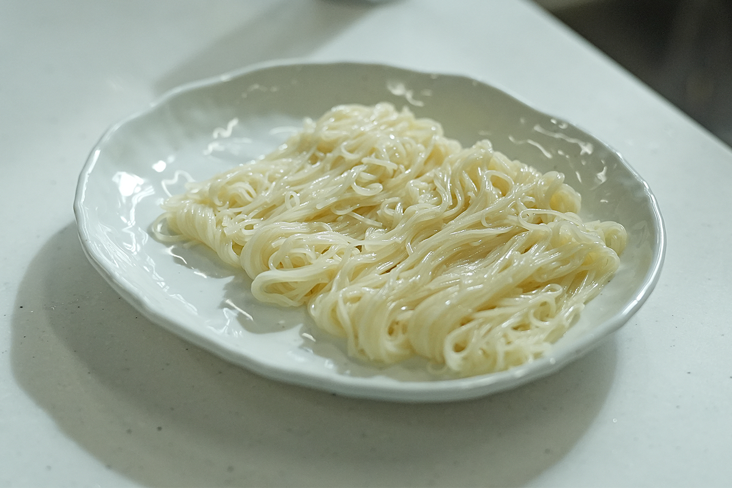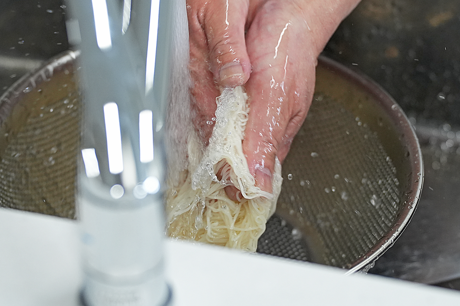 素麺=乾麺 の脆いイメージが強いのか、茹で上がった素麺を洗う時、ほとんど揉み洗いせず水を掛けただけになっている方が多いとの事でした。