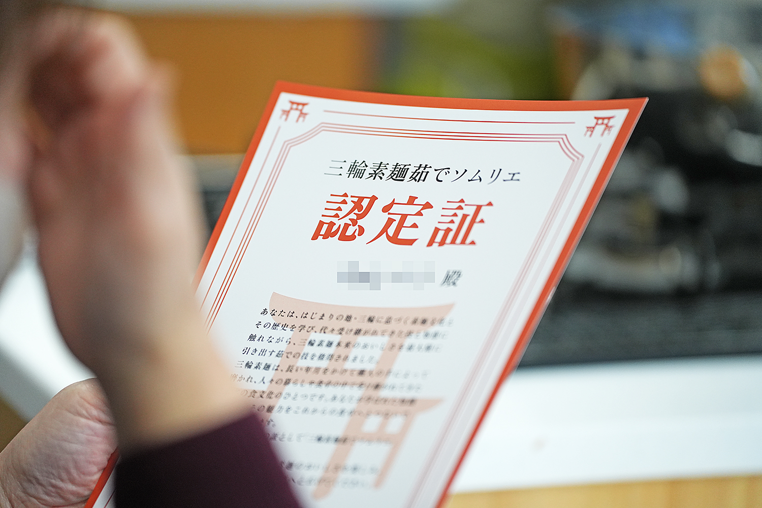 【三輪そうめん茹でソムリエ】の認定証をいただきました。